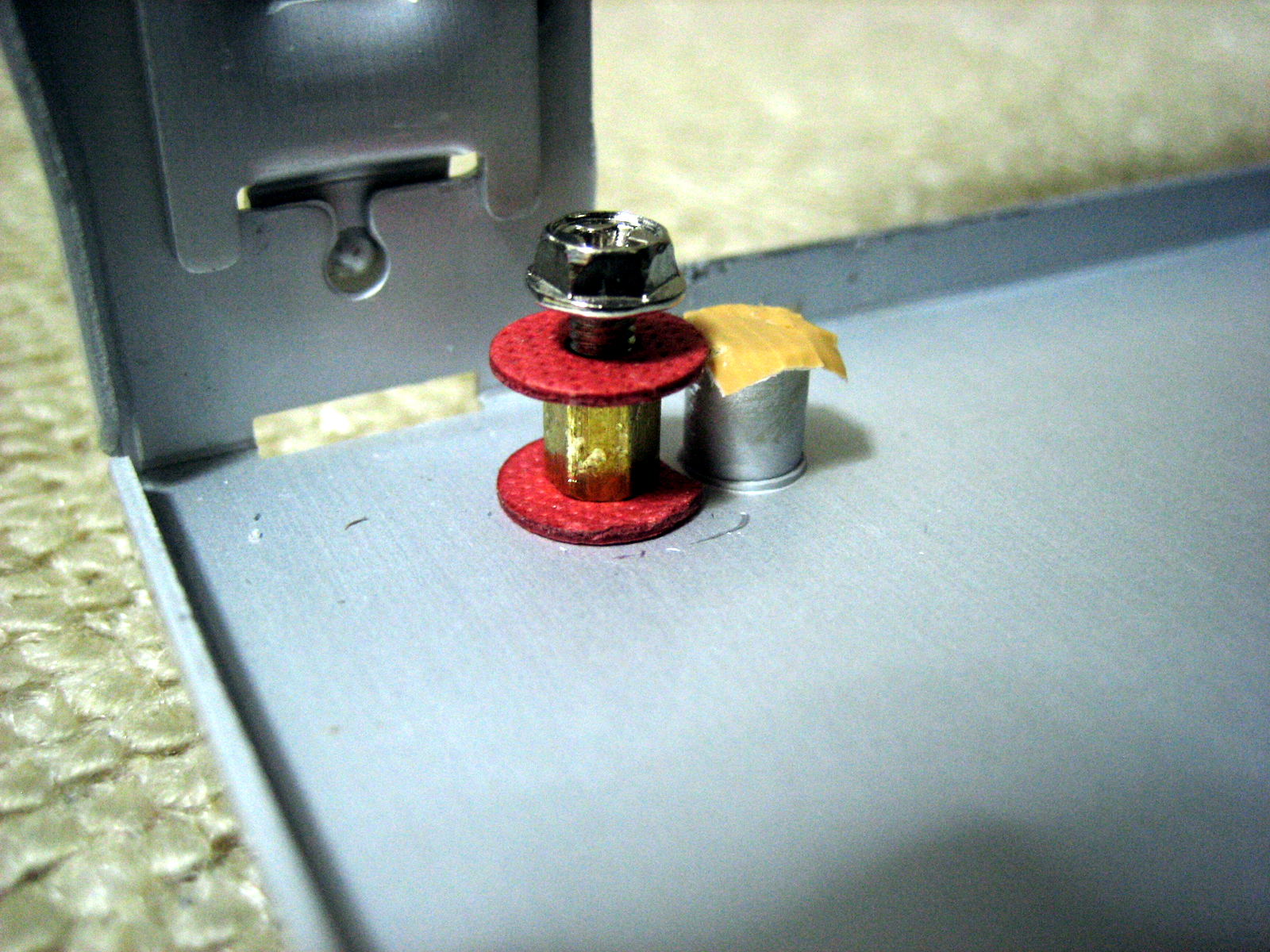穴を開けたら、スペーサーを六角レンチやペンチなどで少し強めに回し込み、ネジ穴の形を作るように押し込みならが回して固定します。(ネジ止め剤も使うことを推奨) 新しく取り付けたスペーサーのネジも、ショート防止のためワッシャーを挟んでおくと良いですね! すぐ隣には、元のスペーサーネジ穴があるので、ASRock H67M-ITXマザーに乗せ替えた時に、基盤がショートしないようにガムテープなどで上(ネジ穴)を必ず塞ぎましょう。 又は、左側2つは取り去ることを強くオススメします。(私は後から取り去りました!) 取り去る場合は、元のスペーサーをペンチで強く挟み、左右にグラグラ・・・と何度もやれば、ポキッ!っと取れます。 [写真参照] ※加工したあとは、PCケース全体を必ずエアースプレー等で掃除しましょう!細かいアルミの破片などが残ってると、マザーボードがショートすることもあるので注意! |
